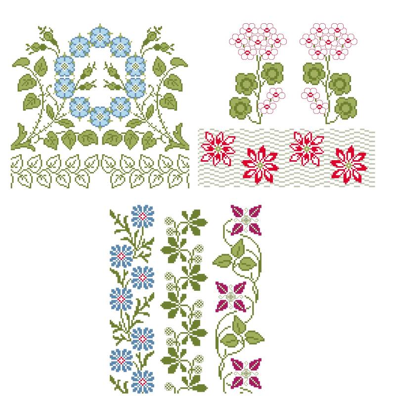 Re-charted from a French ladies magazine dated the 8th of march 1868, this small collection of designs include a pretty posy of Angel’s trumpets and the pattern for a large, colorful cross.