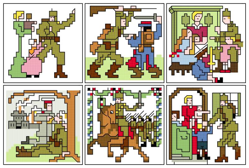 This pattern is re-charted from a set of old Alpursa chocolate vignettes, they depict the soldiers’ life as he goes off to war, visits his family when on leave, gets wounded, victorious, then the return home.