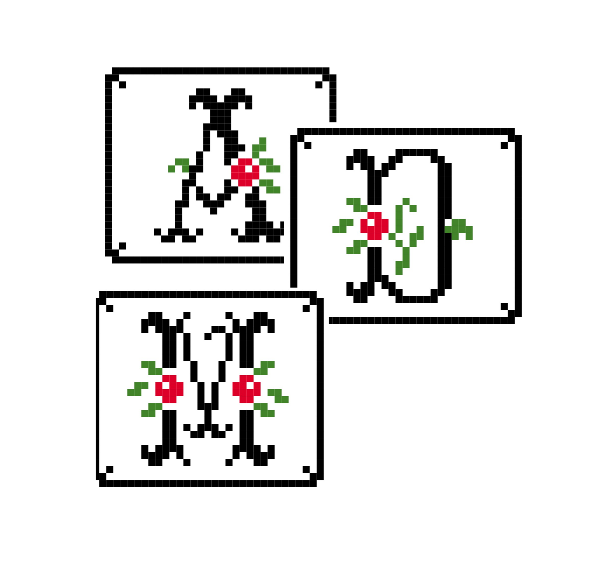 Original hand painted, antique chart on the right, and the digitalized patterns on the left. In black and white, and color with symbols.