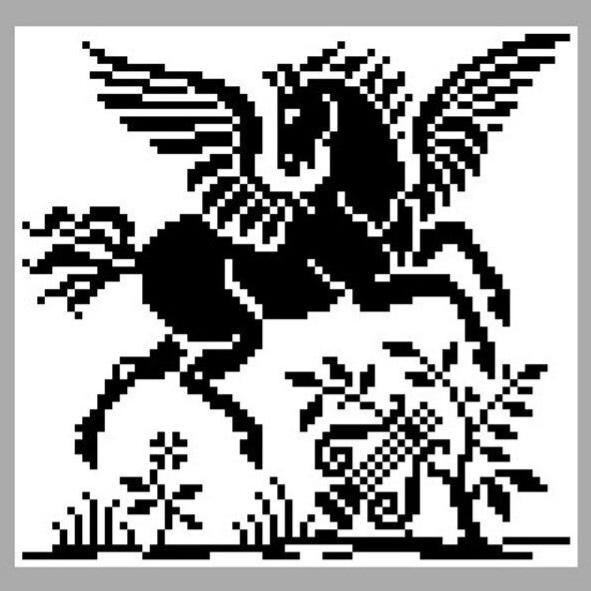 Pegasus the legendary winged horse, is portrayed with a lyre in this easy to stitch monochrome counted pattern.