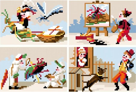 Four patterns charted from an antique hand painted, miniature, accordion booklet.