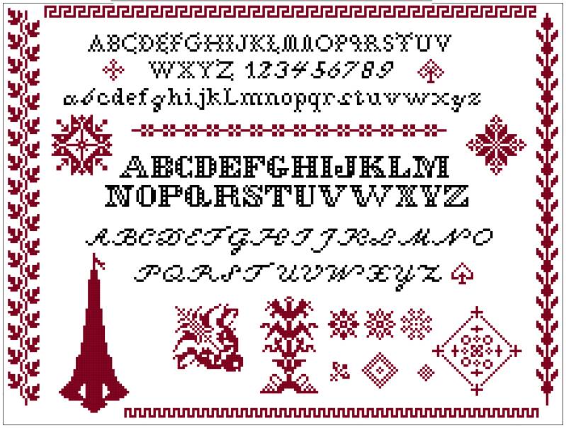 Along with the classic uppercase, and lowercase alphabet and numerals, the sampler also has four decorative border strips and several little motifs which could be used for other projects too.